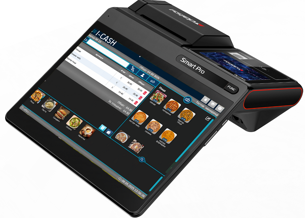 Android 13 OS. Основен екран 10″ + клиентски дисплей 4″. Octa-Core 2 GHz процесор – до 200 % по-бърз от стандартни POS терминали